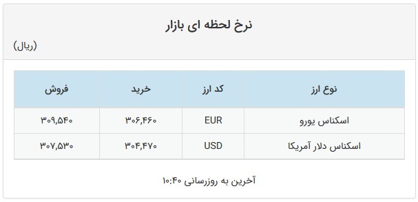 قیمت فروش یورو نیز در صرافیهای بانکها، ۳۰۹۵۴۰ ریال و نرخ خرید آن ۳۰۶۴۶۰ ریال اعلام شده است.