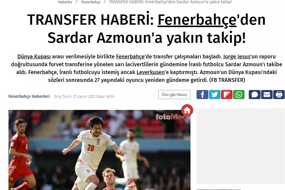 بعد از این صحبتها بود که فنرباغچه بلافاصله مجدداً پرونده انتقال سردار را باز کرد و حالا طبق ادعای نشریه fotomac، پیشنهاد رسمی برای جذب مهاجم ایران به زودی ارائه خواهد شد.