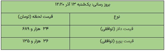 قیمت فروش یوروی توافقی نیز معادل ۳۶ هزار و ۱۳۵ تومان اعلام شده است.