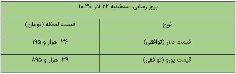 قیمت فروش یوروی توافقی نیز معادل ۳۹ هزار و ۸۹۵ تومان اعلام شده است.