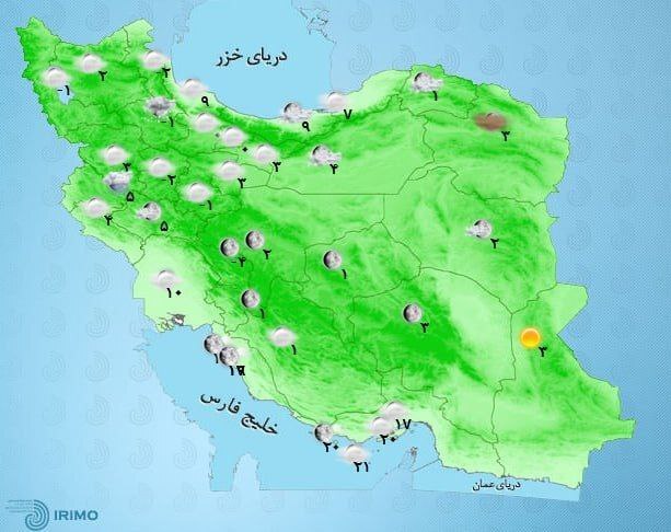 دوشنبه 1401/10/05: هرمزگان، نیمه جنوبی سیستان و بلوچستان، جنوب کرمان و ارتفاعات تهران، قزوین، سمنان، البرز، گیلان، مازندران، گلستان، خراسان شمالی و شمال خراسان رضوی.