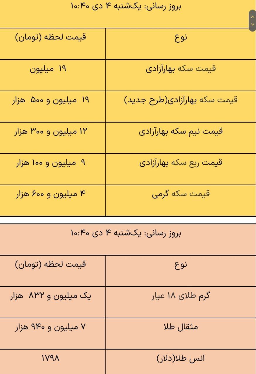 هماکنون در بازار آزاد، قیمت طلای 18عیار هر گرم یک میلیون و 832 هزار تومان، قیمت سکه تمامبهار آزادی طرح قدیم 19 میلیون تومان و قیمت سکه تمامبهار آزادی طرح جدید نیز 19 میلیون و 500 هزار تومان است.