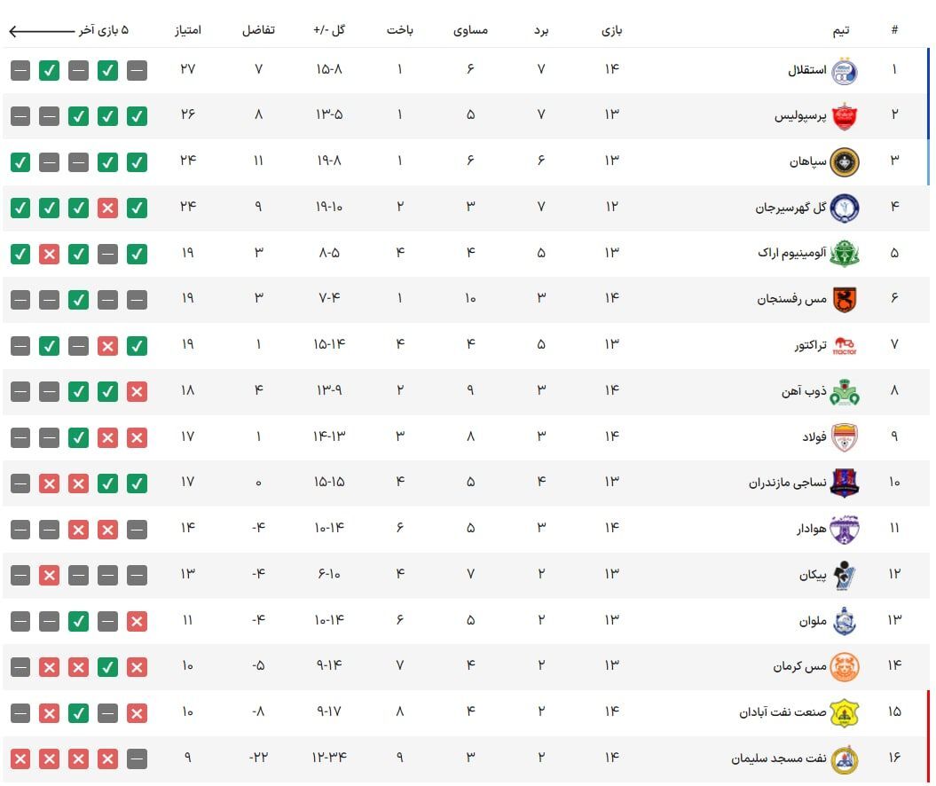نتایج دیدارهای امروز هفته چهاردهم لیگ برتر فوتبال به شرح زیر است: