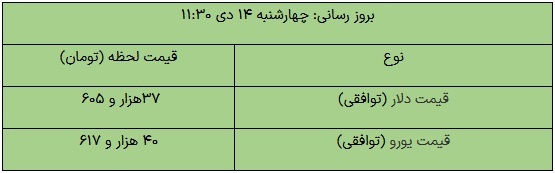 تسنیم: امروز ۱۴ دی ۱۴۰۱ در بازار متشکل ارزی در لحظه انتشار این گزارش، قیمت فروش دلار توافقی ۳۷ هزار و ۶۰۵ تومان اعلام شده است. قیمت فروش یوروی توافقی نیز معادل ۴۰ هزار و ۶۱۷ تومان اعلام شده است.