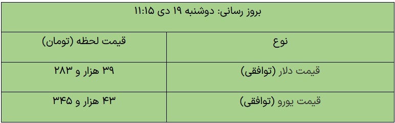 تسنیم: امروز ۱۹ دی ۱۴۰۱ در بازار متشکل ارزی در لحظه انتشار این گزارش، قیمت فروش دلار توافقی ۳۹ هزار و ۲۸۳ تومان اعلام شده است. قیمت فروش یوروی توافقی نیز معادل ۴۳ هزار و ۳۴۵ تومان اعلام شده است.