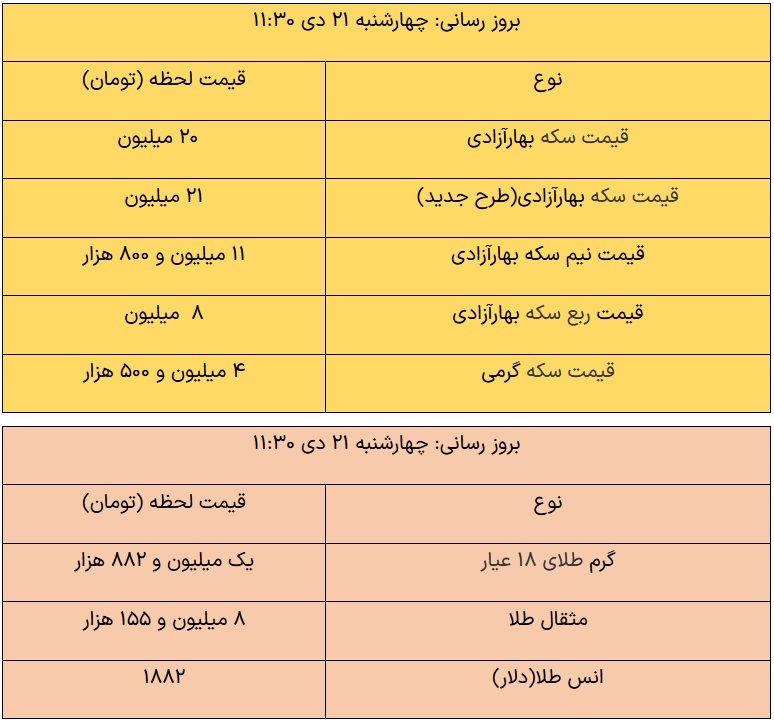 هماکنون در بازار آزاد، قیمت طلای ۱۸ عیار هر گرم یک میلیون و ۸۸۲ هزار تومان، قیمت سکه تمامبهار آزادی طرح قدیم ۲۰ میلیون تومان و قیمت سکه تمامبهار آزادی طرح جدید نیز ۲۱ میلیون تومان است.