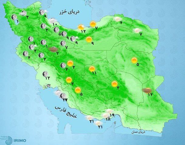 کارشناس سازمان هواشناسی خاطر نشان کرد: روز سه‌شنبه بارش‌ها در استان‌های کرمان، یزد و مناطقی از اصفهان و ارتفاعات البرز شرقی به شکل پراکنده ادامه خواهد یافت و روز چهارشنبه نیز این شرایط در جنوب کرمان، خراسان جنوبی و شمال سیستان و بلوچستان ایجاد می‌شود.