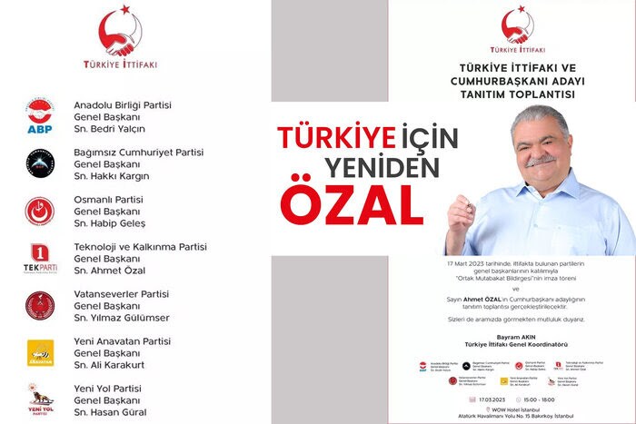 به گزارش این رسانه، حزب اتحاد آناتولی، حزب جمهوری خواه مستقل، حزب عثمانی، حزب فناوری و توسعه (تک.پارتی)، حزب راه نو و حزب میهن که ائتلاف «ترکیه» را تشکیل میدهند، از نامزدی احمد اوزال اعلام حمایت کردهاند.