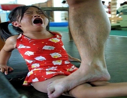 در این تصویر ظاهرا مربی ژیمناستیک چینی برای نرم کردن ماهیچه های این کودک بر روی پاهای وی ایستاده است.