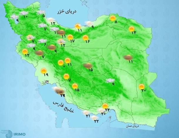 صادق ضیاییان درباره شرایط جوی کشور اظهار کرد: دوشنبه (۲۱ فروردین) در غالب مناطق کشور جوی آرام و پایدار مستقر است. ساعات بعد از ظهر در مناطقی از شمال غرب و ارتفاعات زاگرس جنوبی واقع در جنوب سیستان و بلوچستان و کرمان افزایش ابر و رگبار پراکنده رخ میدهد.
