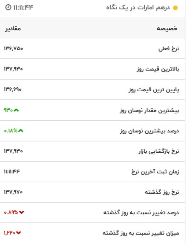 امروز ۲۷ فروردین ۱۴۰۲ درهم امارات ۱۳ هزار و ۶۷۵ تومان قیمت گذاری شد.