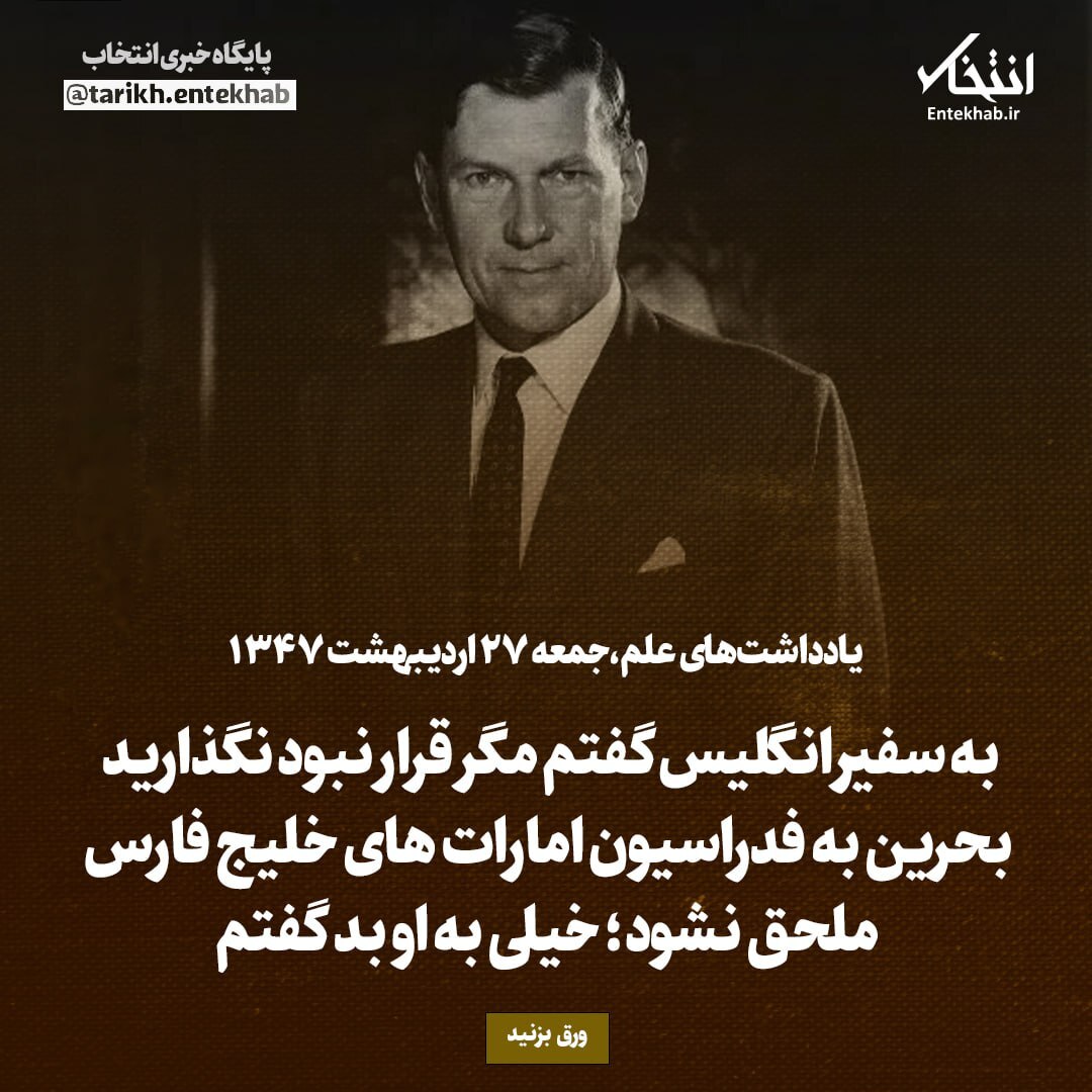 یادداشت‌های علم، جمعه ۲۷ اردیبهشت ۱۳۴۷: به سفیر انگلیس گفتم مگر قرار نبود نگذارید بحرین به فدراسیون امارات‌های خلیج فارس ملحق نشود؛ خیلی به او بد گفتم