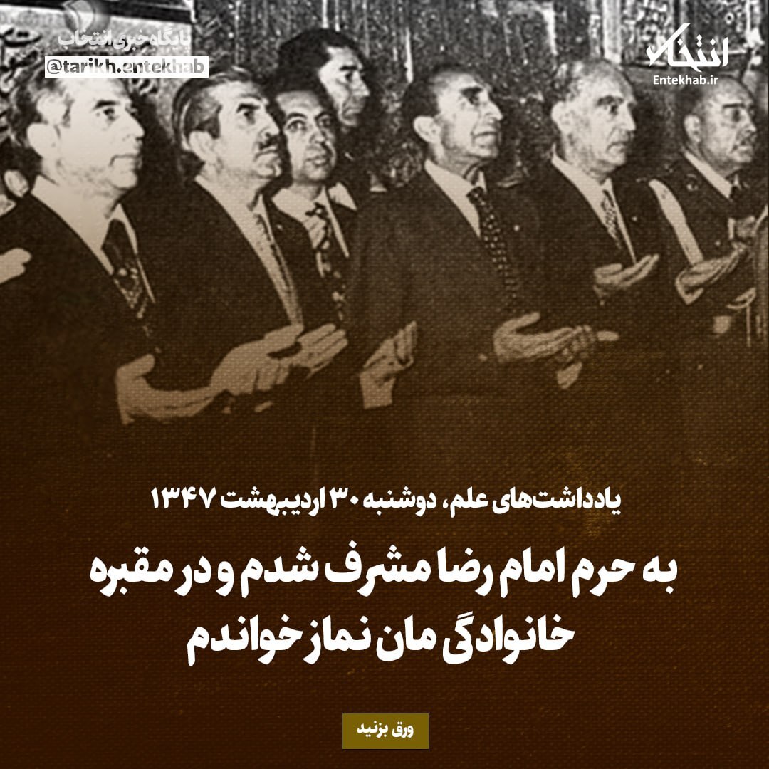یادداشتهای علم، دوشنبه ۳۰ اردیبهشت ۱۳۴۷: به حرم امام رضا مشرف شدم و در مقبره خانوادگی مان نماز خواندم