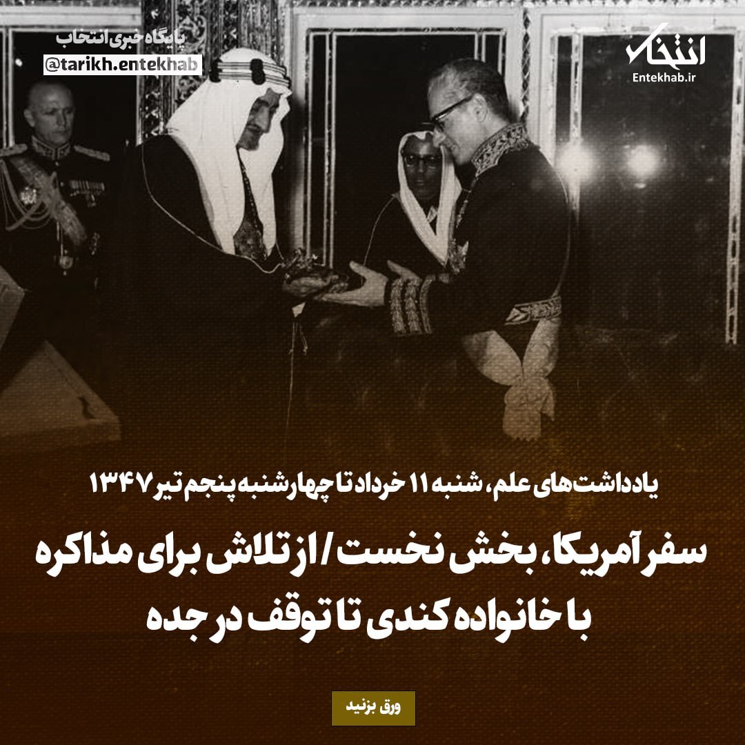 یادداشتهای علم، شنبه ۱۱ خرداد تا چهارشنبه ۵ تیر ۱۳۴۷: سفر آمریکا، بخش نخست / از تلاش برای مذاکره با خانواده کندی تا توقف در جده