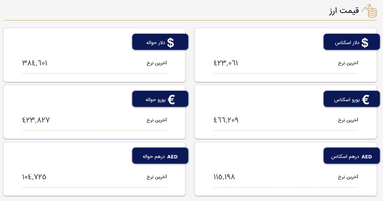در تابلوی معاملاتی مرکز مبادله ارز و طلای ایران، امروز ۱۹ اردیبهشت ماه قیمت هر اسکناس دلار ۴۲ هزار و ۳۰۶ تومان و نرخ حواله دلار ۳۸ هزار و ۴۶۰ تومان اعلام شد.