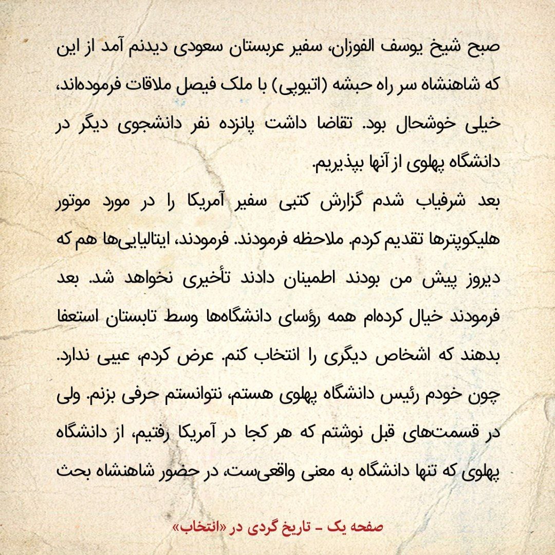 یادداشتهای علم: بعد شرفیاب شدم. گزارش کتبی سفیر آمریکا را در مورد موتور هلیکوپترها تقدیم کردم. ملاحظه فرمودند، فرمودند ایتالیاییها هم که دیروز پیش من بودند اطمینان دادند تأخیری نخواهد شد. بعد فرمودند خیال کرده ام همه رؤسای دانشگاهها وسط تابستان استعفا بدهند که اشخاص دیگری را انتخاب کنم. عرض کردم عیبی ندارد. چون خودم رئیس دانشگاه پهلوی هستم، نتوانستم حرفی بزنم ولی قسمتهای قبل نوشتم که هر کجا در آمریکا رفتیم از دانشگاه پهلوی که تنها دانشگاه به معنی واقعیست در حضور شاهنشاه بحث شد.