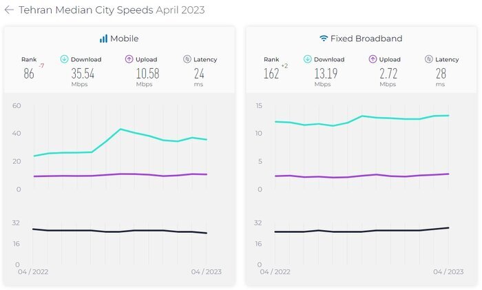 سایت جهانی اسپیدتست در آمار جدید که از ماه آوریل (۱۲ فروردین تا ۱۰ اردیبهشت) ارائه کرده، به افزایش سرعت اینترنت ثابت و کاهش یک پلهای سرعت اینترنت سیار در کشورمان اشاره دارد.