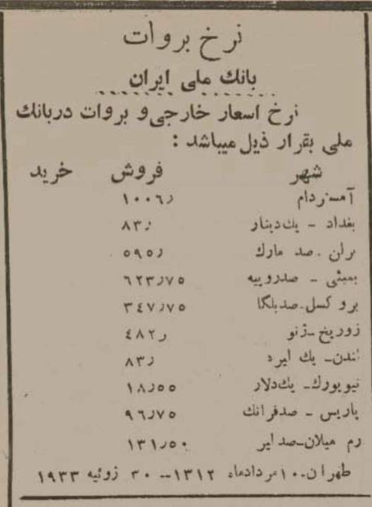 روزنامه اطلاعات در ۱۰ مرداد ۱۳۱۲، قیمت ارز‌های روز آن دوره را منتشر کرده است که در تصویر می‌بینیم. در این شماره از روزنامه اطلاعات، ارز‌هایی شامل روپیه، مارک، لیره، دلار و بلکا و فرانک دیده می‌شود.