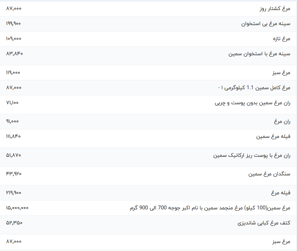 سرویس اقتصاد «انتخاب»: قیمت گوشت مرغ، امروز ۱۹ اسفند ۱۴۰۲ شامل ران مرغ، مرغ زنده، مرغ بدون استخوان، فیله مرغ، پا مرغ، مرغ کشتار روز، ران مرغ با پوست و مرغ سبز اعلام شد.