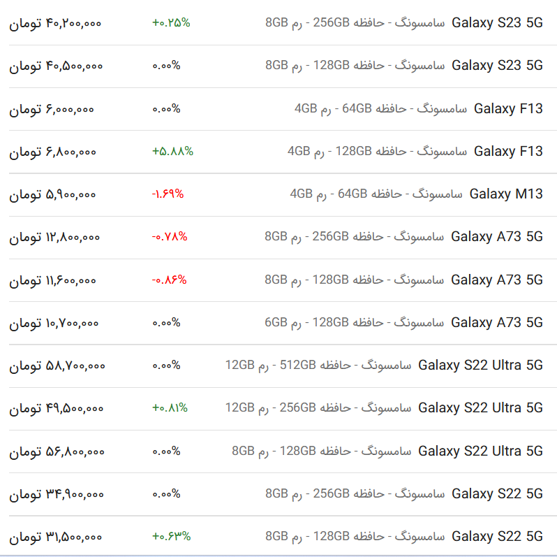 قیمت گوشی‌های سامسونگ، امروز ۱۱ فروردین ۱۴۰۳ در مدل‌های «GALAXY S ۲۳-S ۱۳-A ۷۳ -M ۱۳، ۵-S ۲۳» به ثبت رسید.