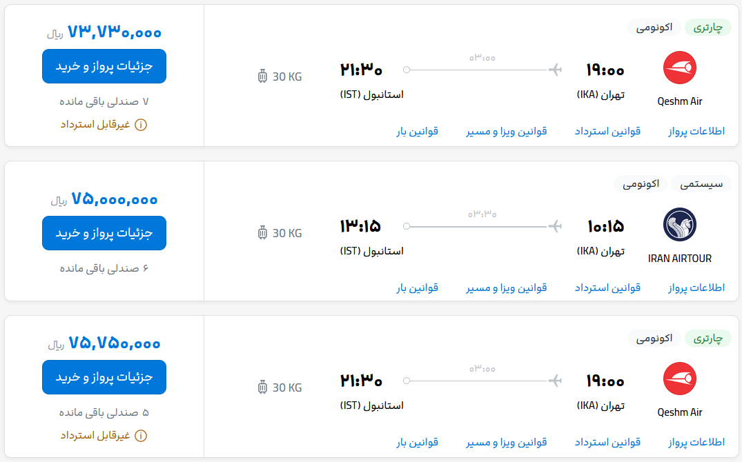 سرویس اقتصاد «انتخاب»: قیمت بلیط هواپیما تهران-استانبول، امروز ۲۶ اردیبهشت ۱۴۰۳ با پروازهای شرکت قشم ایر و ایران ایر اعلام شد. قیمت بلیط هواپیما تهران-استانبول، امروز ۷ میلیون و ۵۷۵ تومان و ۷ میلیون و ۳۷۳ هزار تومان به ثبت رسید.