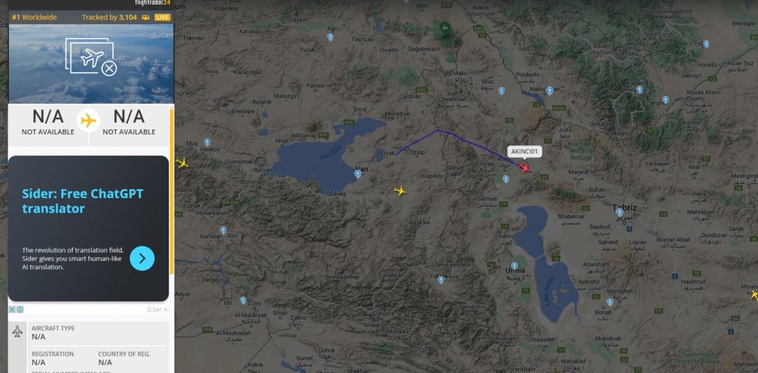 بررسی سایت راداری فلایت ۲۴ حاکی از ورود پهپاد آکینجی (AKINCI۰۱) ترکیه که به تجهیزات دید در شب مجهز است به آسمان ایران است.
