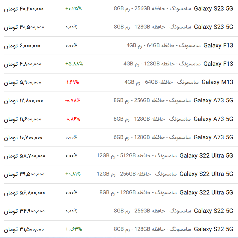 سرویس اقتصاد «انتخاب»: قیمت گوشیهای سامسونگ، امروز ۵ خرداد ۱۴۰۳ در مدلهای «GALAXY S ۲۳-S ۱۳-A ۷۳ -M ۱۳، ۵-S ۲۳» به ثبت رسید.