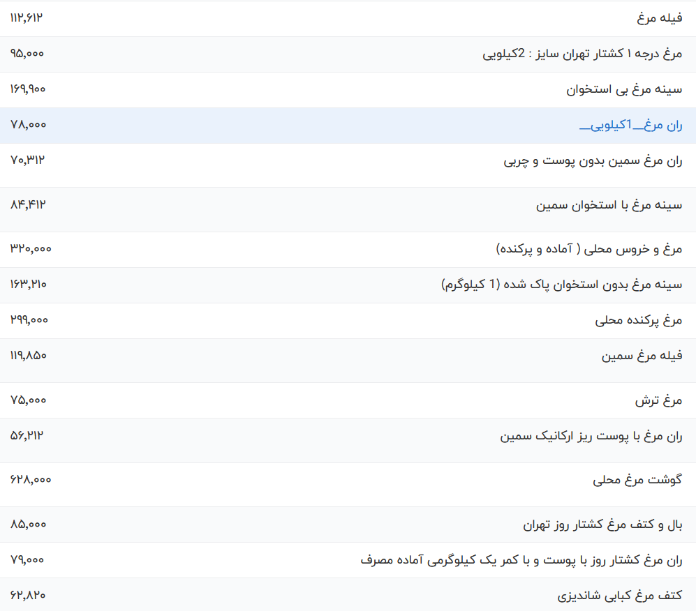 قیمت گوشت مرغ، امروز ۷ خرداد ۱۴۰۳ شامل ران مرغ، مرغ زنده، مرغ بدون استخوان، فیله مرغ، پا مرغ، مرغ کشتار روز، ران مرغ با پوست و مرغ سبز اعلام شد.