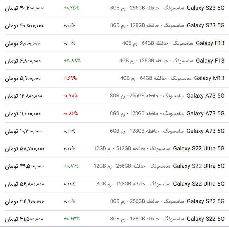 سرویس اقتصاد «انتخاب»: قیمت گوشیهای سامسونگ، امروز ۲۱ خرداد ۱۴۰۳ در مدلهای «GALAXY S ۲۳-S ۱۳-A ۷۳ -M ۱۳، ۵-S ۲۳» به ثبت رسید.