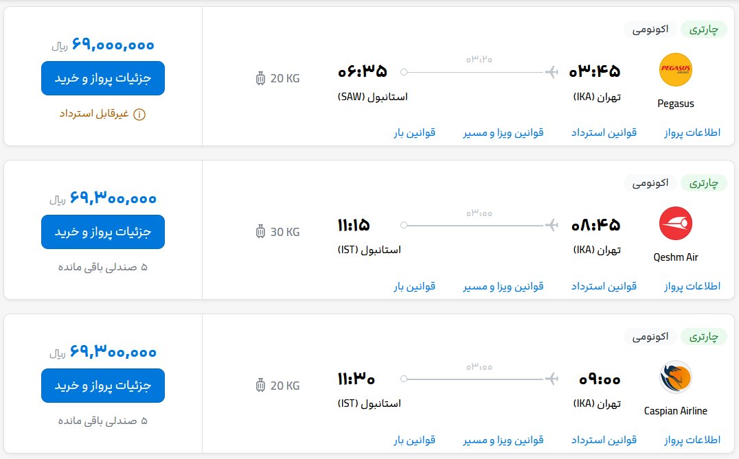 سرویس اقتصاد «انتخاب»: قیمت بلیط هواپیما تهران-استانبول، امروز ۲۸ تیر ۱۴۰۳ با پروازهای شرکت معراج و پگاسوس اعلام شد. قیمت بلیط هواپیما تهران-استانبول، امروز ۶ میلیون و ۹۰۰ هزار تومان و ۶ میلیون و ۹۳۰ هزار تومان به ثبت رسید.
