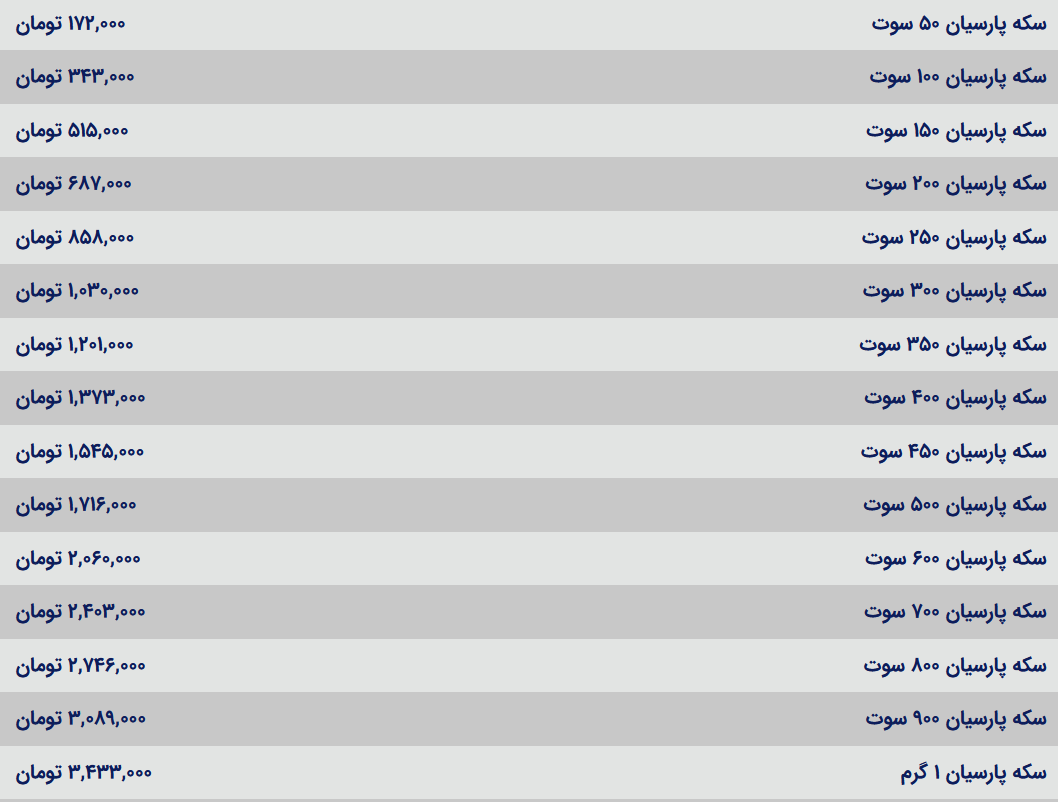 قیمت سکه پارسیان، امروز ۹ مرداد ۱۴۰۳، در مقادیر ۵۰ صوت تا ۱گرم، به ثبت رسید