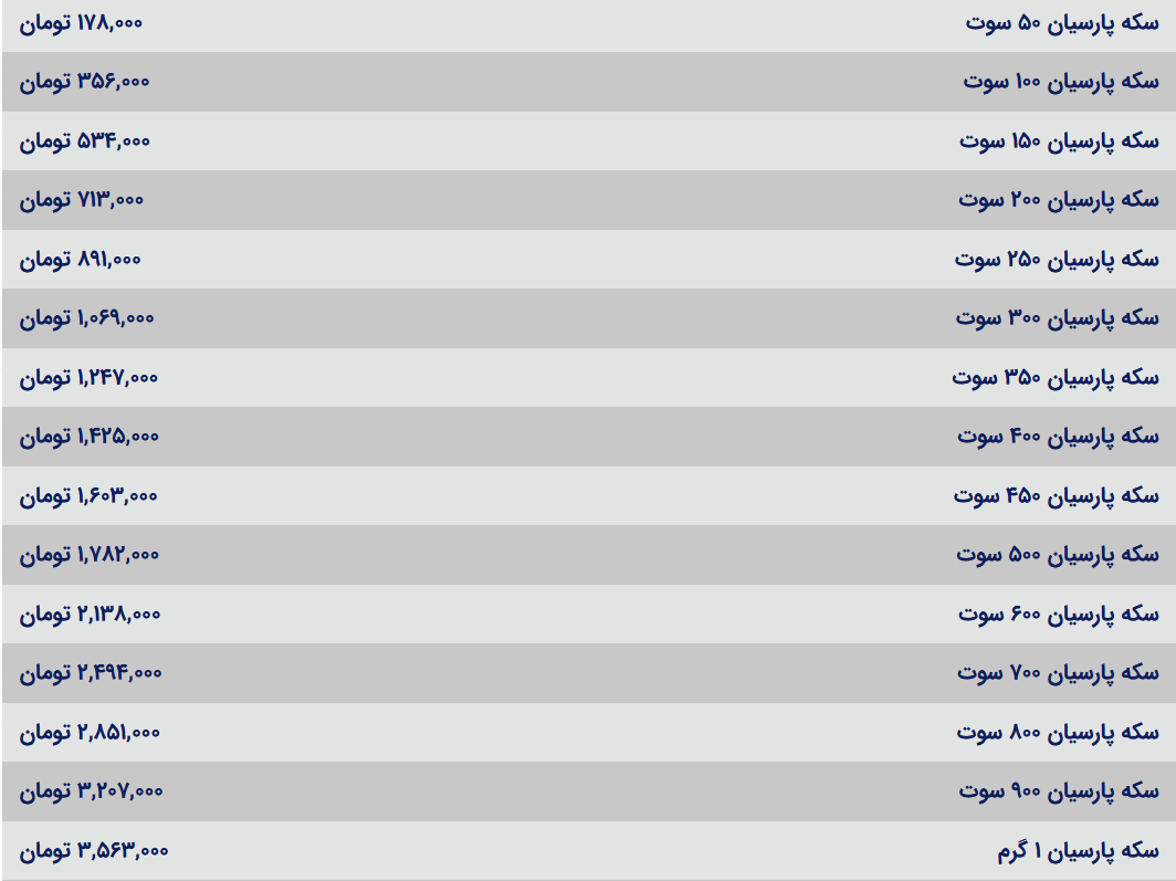قیمت سکه پارسیان، امروز ۱۱ مرداد ۱۴۰۳، در مقادیر ۵۰ صوت تا ۱گرم، به ثبت رسید