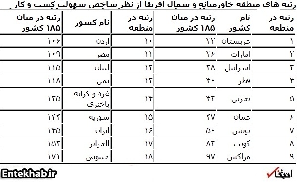 در گزارش تازه بانک جهانی، جایگاه ایران از نظر رتبه سهولت کسب و کار در میان ۲۰ کشور منطقه خاورمیانه و شمال آفریقا نیز رتبه‌ای نه چندان امیدوارکننده است؛‌ ایران در میان این ۲۰ کشور،‌ رتبه شانزدهم را به خود اختصاص داده و پس از ایران فقط سه کشور الجزایر، عراق و جیبوتی قرار گرفته‌اند و لیبی نیز از اساس در این گزارش مورد مطالعه گزارشگران بانک‌جهانی، قرار نگرفته است.