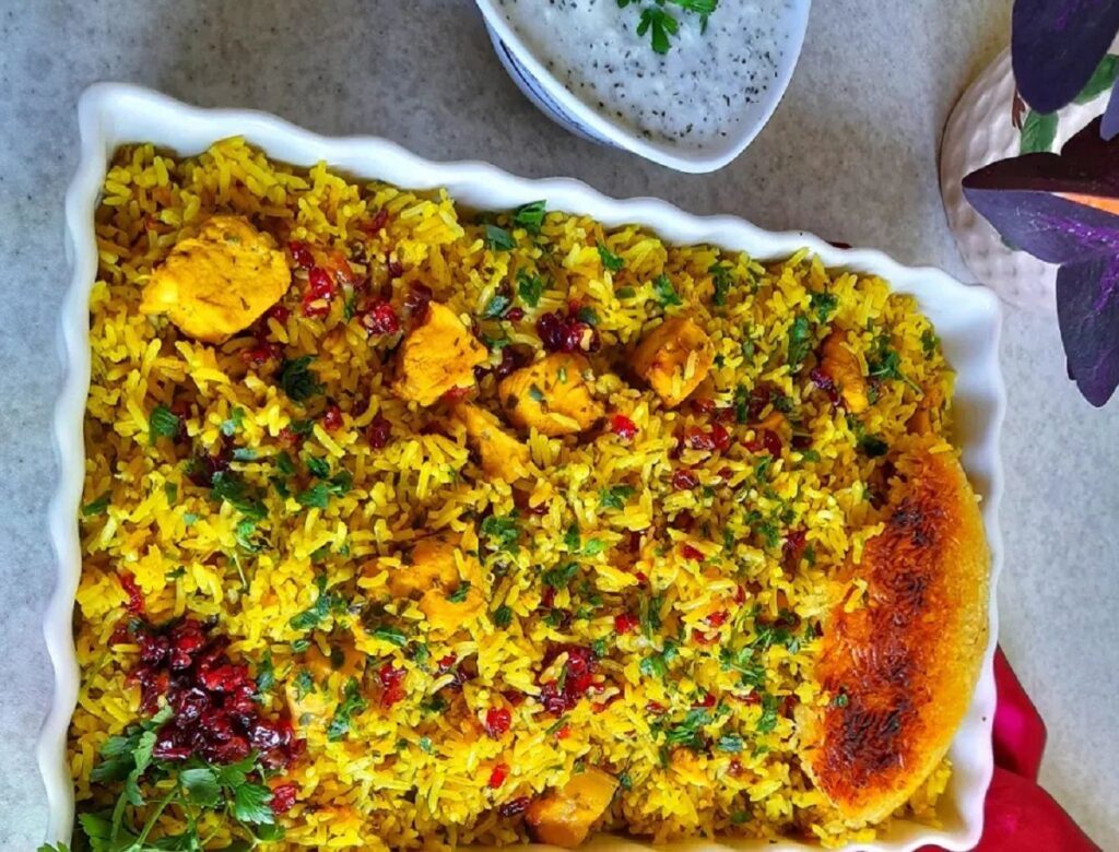 بعد تقریبا ۴۵ دقیقه تا یک ساعت برنج دم میکشد و مرغها هم خوب پخته میشوند، سپس قابلمه را از روی حرارت بردارید و در یک ظرف مناسب برگردانید تا به شکل قالبی از ظرف خارج شود و بعد با چند برگ جعفری و نعناع روی آن را تزئین کنید.