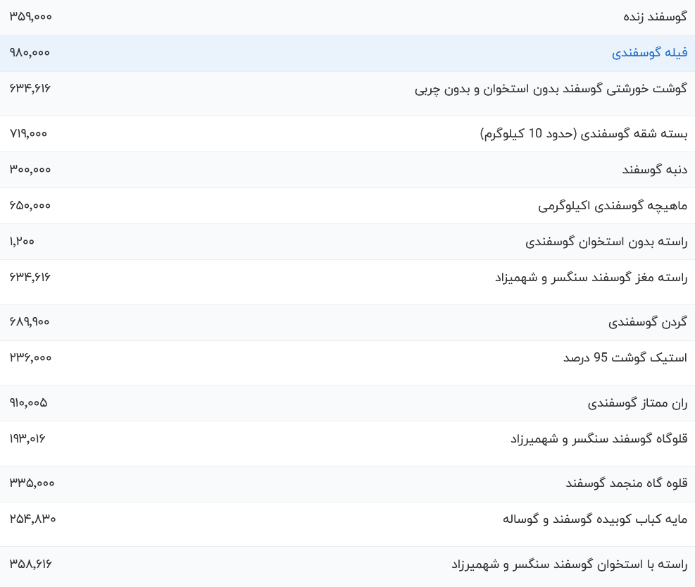 قیمت گوشت قرمز، امروز ۲۰ شهریور ۱۴۰۳ شامل گوسفند زنده، ران گوسفندی، سردست گوسفندی، دنبه گوسفندی، قلوه گوسفندی، شقه گوسفندی، پرده گوسفندی، چرخ کرده گوسفندی بدون چربی و فیله گوسفندی اعلام شد.