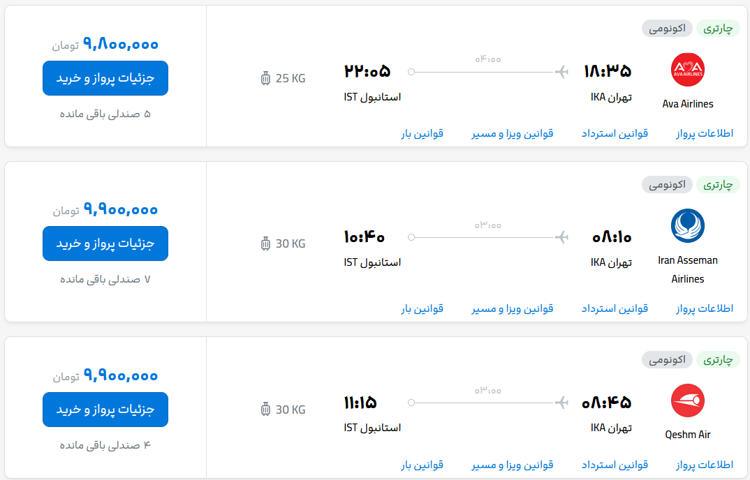سرویس اقتصاد «انتخاب»: قیمت بلیط هواپیما تهران-استانبول، امروز ۲۰ شهریور ۱۴۰۳ با پروازهای شرکت آوا و تابان ایر اعلام شد. قیمت بلیط هواپیما تهران-استانبول، امروز ۹ میلیون و ۸۰۰ هزار تومان و ۹ میلیون و ۹۰۰ هزار تومان به ثبت رسید.