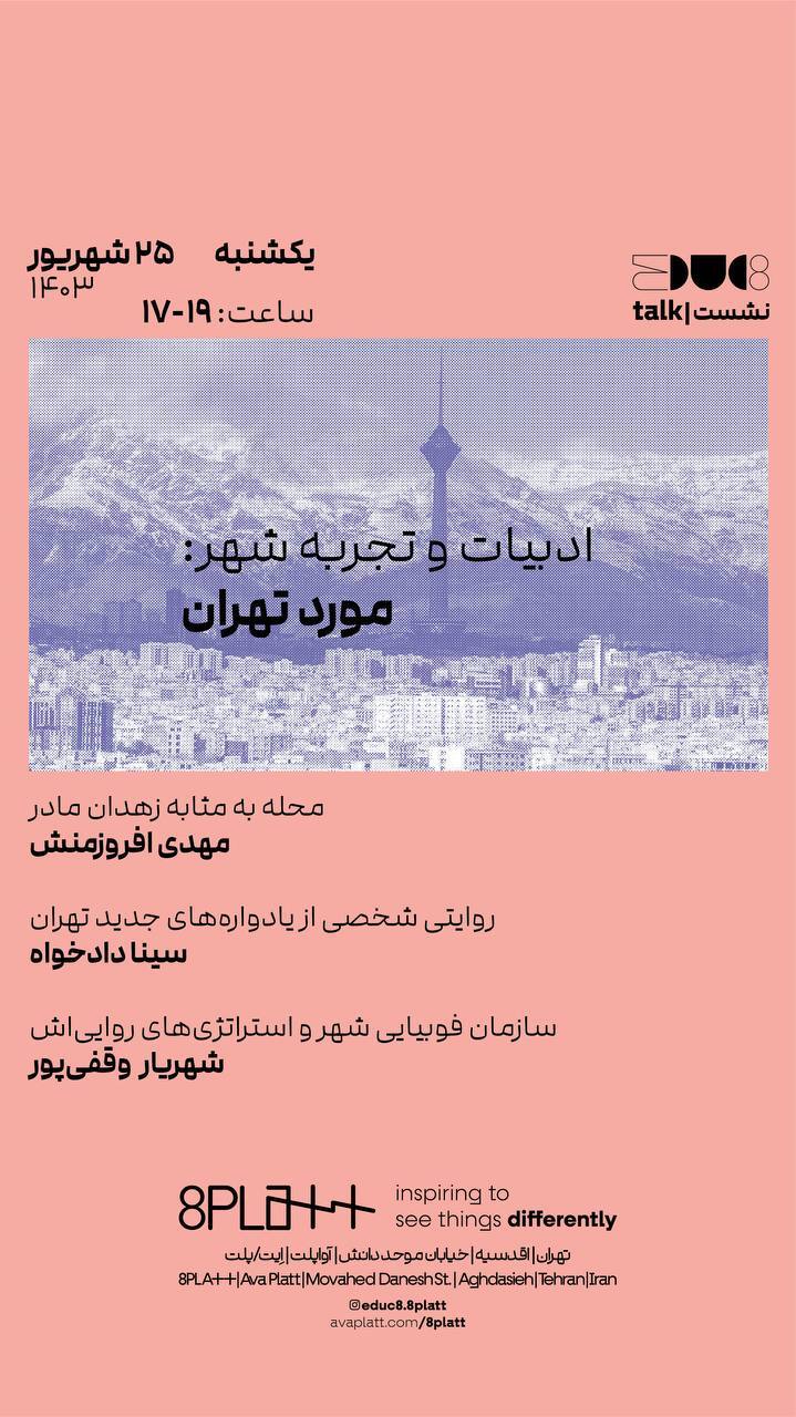 در ادامه ی نشست های تابستان 1403 پلتفرم اجوک/ایت نشستی باعنوان "ادبیات و تجربه شهر: مورد تهران" برگزار خواهد شد. در این نشست شهریار وقفی پور درباره "سازمان فوبیایی شهر و استراتژی های روایی اش"، مهدی افروز منش درباره "محله به مثابه زهدان مادر" و سینا دادخواه با موضوع "روایتی شخصی از یادواره های جدید تهران" به سخنرانی خواهند پرداخت. این نشست از ساعت 17 روز یکشنبه 25 شهریور ماه در اقدسیه، خ موحد دانش، نبش خ فیروز بخش، مجمتع آوا پلت، طبقه هشتم برگزار خواهد شد. علاقمندان برای کسب اطلاعات بیشتر و شرکت در این نشست می توانند با شماره 09122389289 تماس گرفته و یا به وب سایت avaplatt.com/8plattمراجعه کنند.
