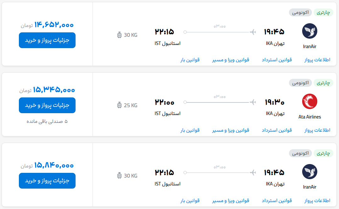سرویس اقتصاد «انتخاب»: قیمت بلیط هواپیما تهران-استانبول، امروز ۲۵ مهر ۱۴۰۳ با پروازهای شرکت قشم ایر اعلام شد. قیمت بلیط هواپیما تهران-استانبول، امروز ۱۴ میلیون ۶۵۲ هزار تومان و ۱۵ میلیون و ۸۴۰ هزار تومان به ثبت رسید.