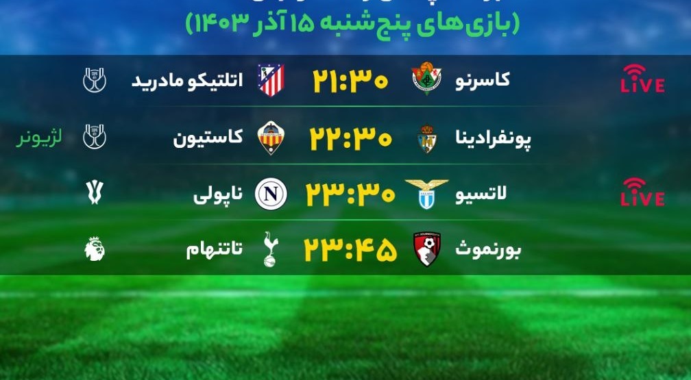 برنامه بازیهای فوتبال امروز پنجشنبه ۱۵ آذر ۱۴۰۳