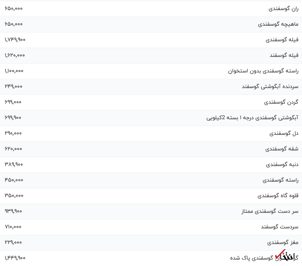 سرویس اقتصاد «انتخاب»: قیمت گوشت قرمز، امروز ۲۴ آذر ۱۴۰۳ شامل گوسفند زنده، ران گوسفندی، سردست گوسفندی، دنبه گوسفندی، قلوه گوسفندی، شقه گوسفندی، پرده گوسفندی، چرخ کرده گوسفندی بدون چربی و فیله گوسفندی اعلام شد