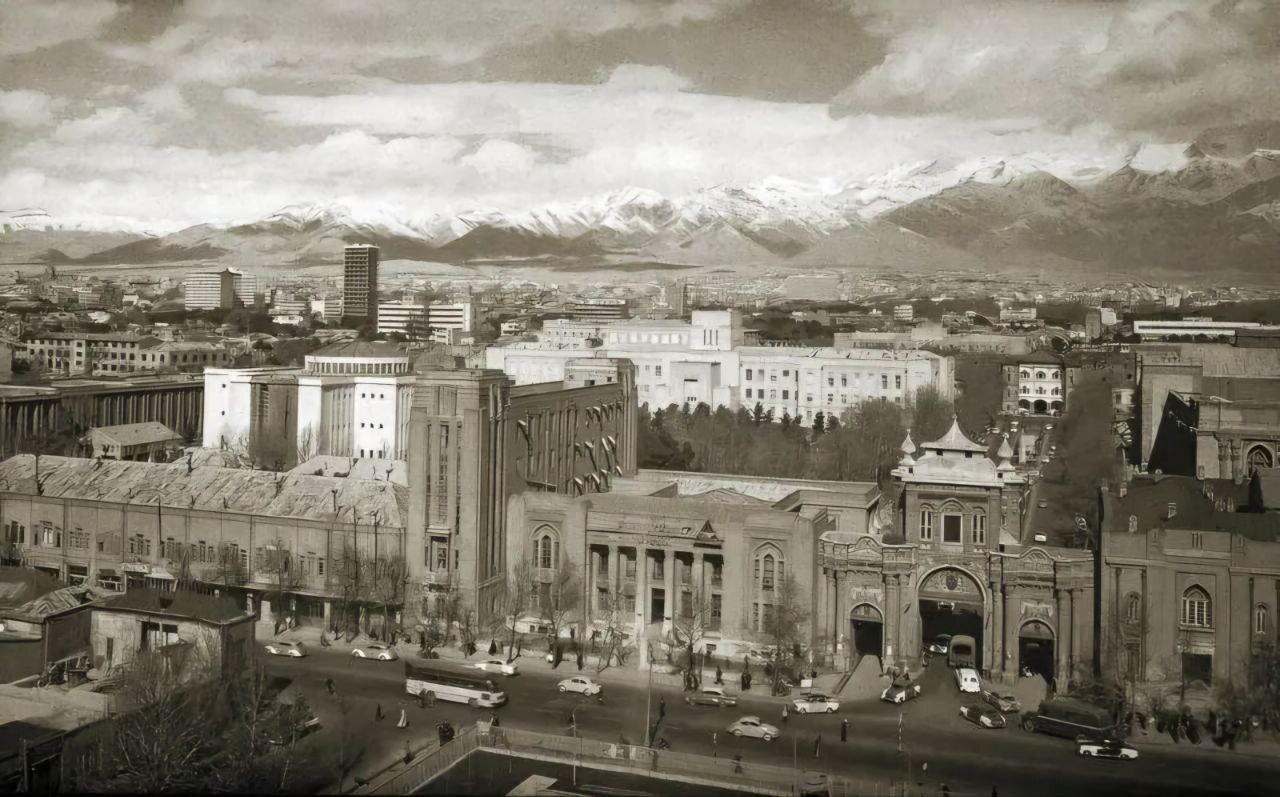 تصویری از نمای تاریخی شهر تهران و کوه‌های برفی در مرکز شهر را ببینید.