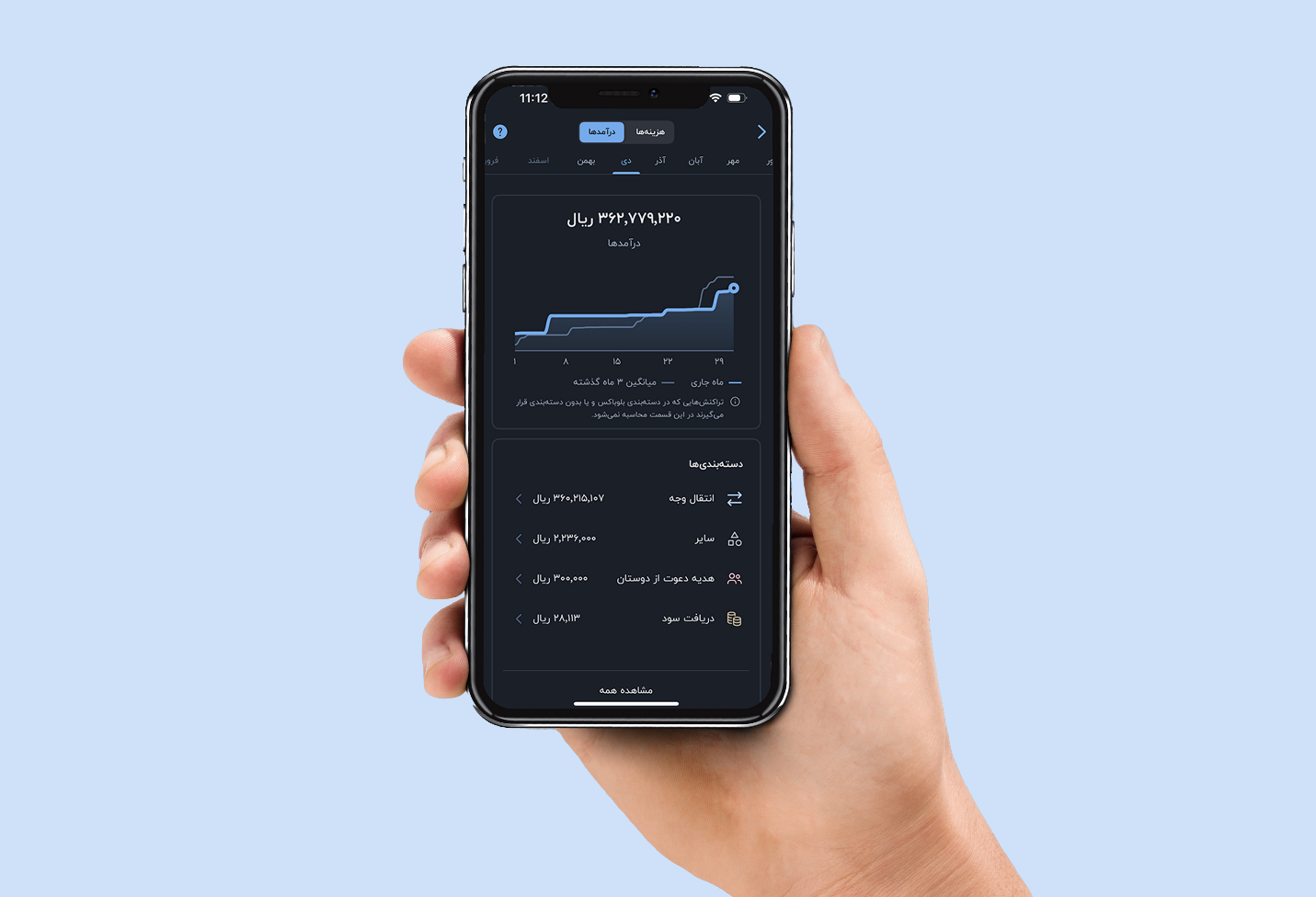 مثلا درآمد من در خرداد ۱۴۰۳، بیشتر از انتقال وجه بوده که در گزارش مالی مبلغ آن را حدود ۳۶ میلیون تومان نشان می‌دهد. در این ماه ۳۰ هزار تومان هم به خاطر دعوت دوستانم به بلو دریافت کرده‌ام، مبلغ کمی هم از دریافت سود به حسابم نشسته و از دسته‌بندی «سایر» هم حدود ۲۲۳ هزار تومان به حسابم واریز شده است. امکان خوبی که در این بخش به من داده شده این است که می‌توانم با انتخاب هر یک از این دسته‌بندی‌ها ببینم که در چه تاریخ و چه ساعتی، چه مبلغی به حسابم واریز شده است.