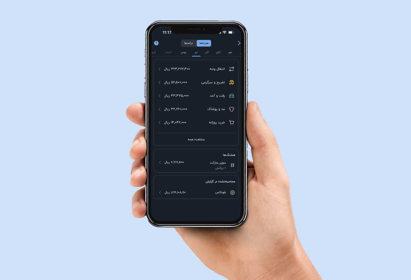 بلو در همین بخش هزینه‌ها به یکی از مهم‌ترین خواسته‌های من پاسخ می‌دهد؛ به من نشان می‌دهد که در یک ماه برای هر دسته از هزینه‌هایم چه مقدار پول خرج کرده‌ام. هر کدام از دسته‌بندی‌ها جزئیات بیشتری هم دارد که به شما نشان می‌دهد در چه تاریخی با چه مبلغی تراکنش انجام داده‌اید. اعداد و ارقامی که بلو در این بخش به من نشان داده برایم جالب و تعجب‌برانگیز بوده است.