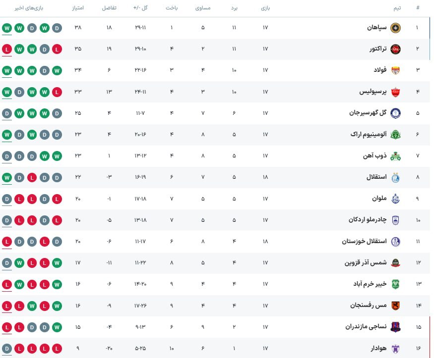 جدول لیگ برتر پس از پایان تک مسابقه روز اول از هفته هجدهم