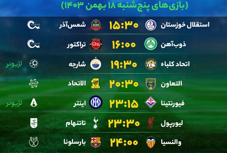 برنامه بازیهای فوتبال امروز پنجشنبه ۱۸ بهمن ۱۴۰۳