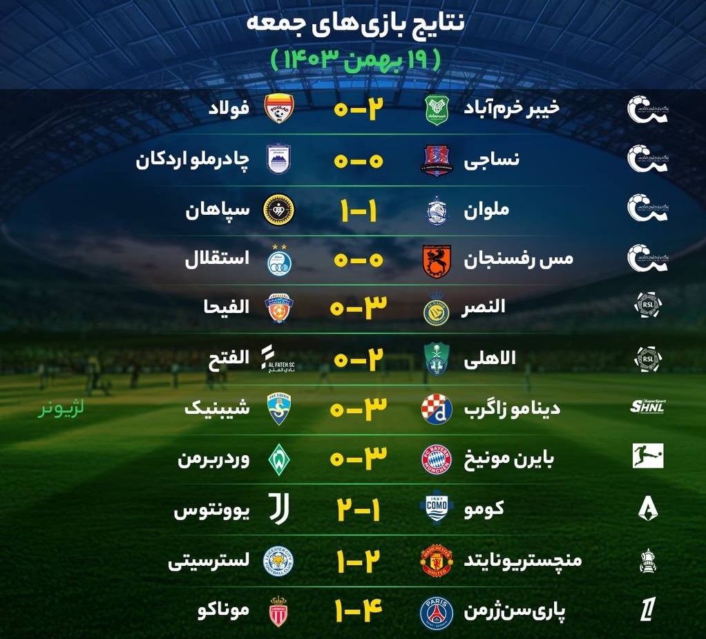 نتایج مهمترین بازیهای فوتبال جمعه ۱۹ بهمن