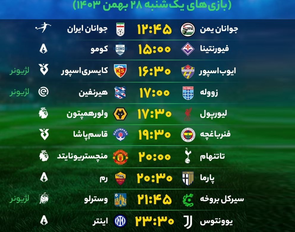 برنامه بازیهای فوتبال امروز یکشنبه ۲۸ بهمن ۱۴۰۳