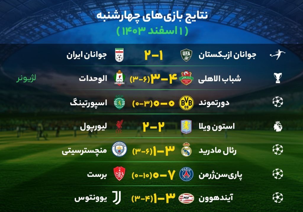 نتایج مهمترین بازیهای چهارشنبه ۱ اسفند