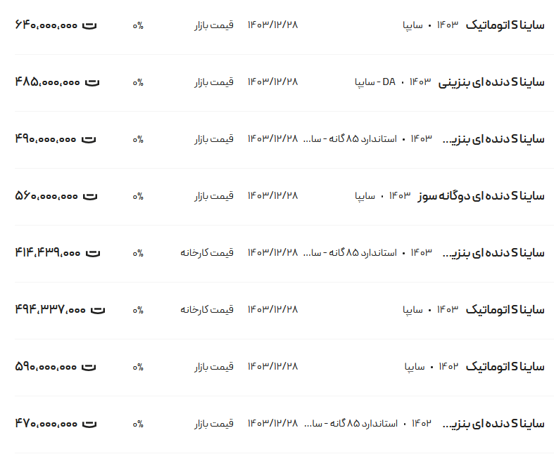 سرویس اقتصاد «انتخاب»: قیمت ساینا، امروز ۹ فروردین ۱۴۰۴ در مدلهای «دندهای، اتوماتیک و دوگانه» اعلام شد.