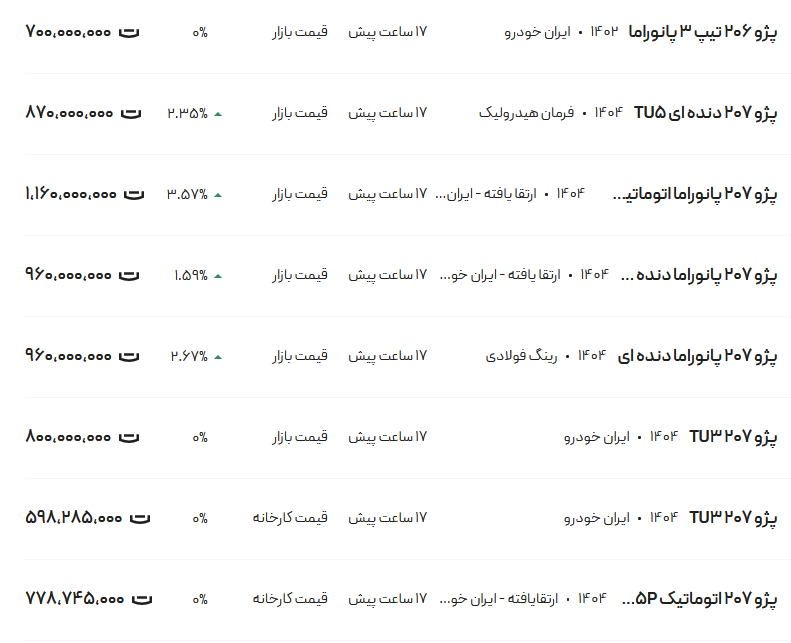سرویس اقتصاد «انتخاب»: قیمت پژو ۲۰۶ و ۲۰۷، امروز ۱۷ فروردین ۱۴۰۴ در مدلهای مختلف شامل «تیپ ۵- تیپ ۲- SD-TU ۵ P-دندهای» اعلام شد.